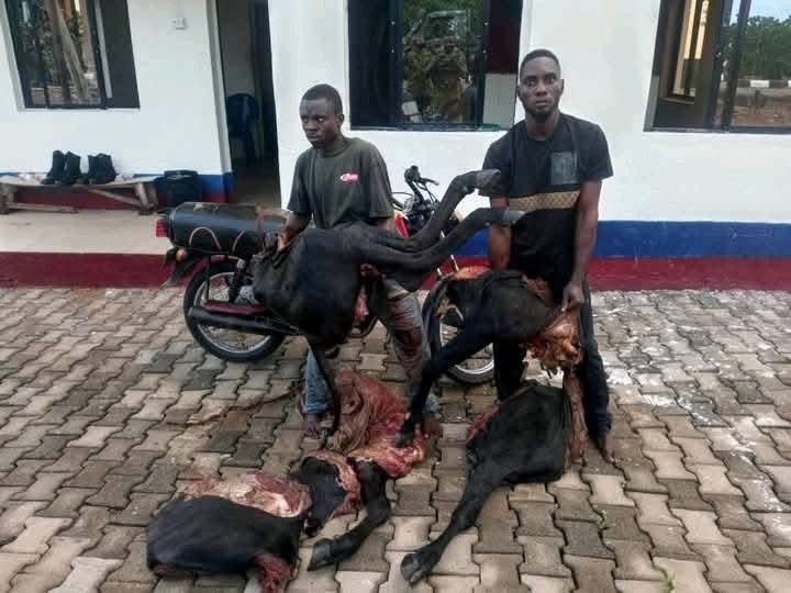 The suspects were apprehended on a motorcycle carrying a sack of freshly butchered cow meat. Upon interrogation, they claimed the meat had been purchased from a Fulani herder inside the forest. However, preliminary investigations revealed that the meat was linked to a stolen cow reported missing in Tse Pokiau Village, near Daudu.